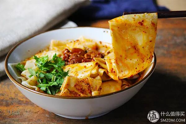 Biángbiáng面(电脑打不出这个字),是陕西关中特色传统风味面食,因为制作过程中有biang、biang的声音而得名。由上等面粉精制而成,用酱油、醋、味精、花椒等佐料调入面汤,捞入面条,淋上烧热的植物油即成。也叫裤袋面,是否是因为很像裤袋呢?