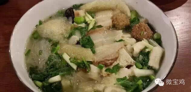 牛骨、鸡鸭肉调好的白汁汤。食者将馍掰好后,经厨师用高汤、蒜苗、粉丝把馍煮好,碗中三鲜颜色鲜亮,高汤色白,香气四溢,所谓丸子黄、肉片红、面皮奶色,再加上一点辣子,更是五颜六色,分外好看,也颇能引人食欲!