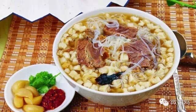 胡辣汤泡馍是一道汉族特色小吃,胡辣汤制作工艺很讲究,混合原料也许多。最常见的原料有面中的混合蛋白、海带丝、粉丝、千张丝、花生米、芫荽、姜末、榨菜、黑胡椒粉等。根据节令和地域的差别,还会添加牛肉、羊肉、黄豆、食用木耳、黄花菜、菠菜、萝卜条、葱花等原料。