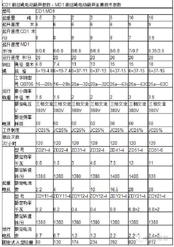 钢丝绳电动葫芦的吨位:0.5T、1T、2T、3T、5T、10T、16T、20T,它的标配钢丝绳米数:6M、9M、12M、18M、24M、30M。它还分为CD1(单速型)和MD1(双速型),钢丝绳电动葫芦的运行速度:0.5T-5T 10T 16T-20T 单速:8M/MIN 单速:7M/MIN 单速:3.5M/MIN双速:8M/MIN,0.8M/MIN,双速:7M/MIN,0.7M/MIN 双速: 3.5M/MIN,0.35M/MIN