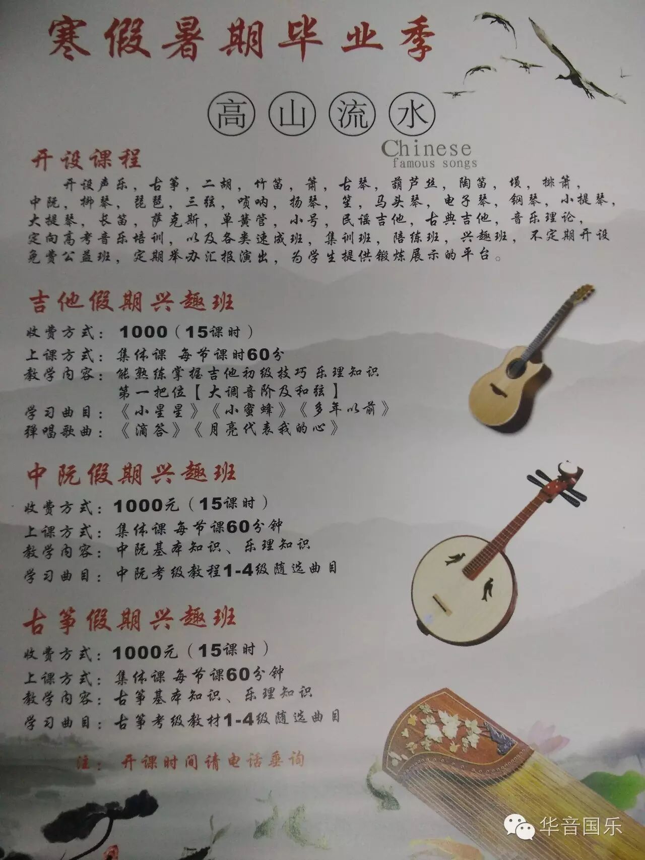 开设声乐,古筝,二胡,竹笛,箫,古琴,葫芦丝,陶笛,埙,排箫,中阮,柳琴,琵琶,三弦,唢呐,扬琴,笙,马头琴,电子琴,钢琴,小提琴,大提琴,长笛,萨克斯,单簧管,小号,民谣吉他,古典吉他,音乐理论,定向高考音乐培训,以及各类速成班,集训班,陪练班,兴趣班,不定期开设免费公益班,定期举办汇报演出,为学生提供锻炼展示的平台。
