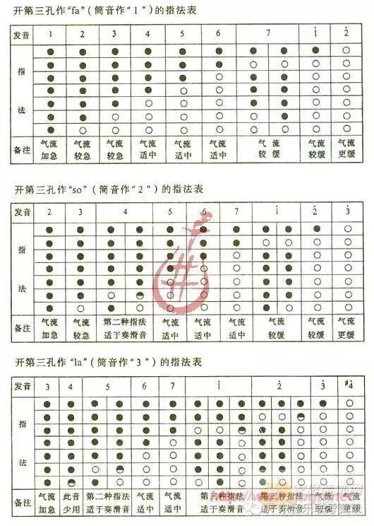 1.右手无名指、中指、食指用第一节指肚分别开闭第一、二、三个音孔,拇指拖于主管下方。左手无名指、中指、食指用第一节指肚分别开闭,第四、第五、第六音孔,拇指开开位于主管前下方的第七音孔。