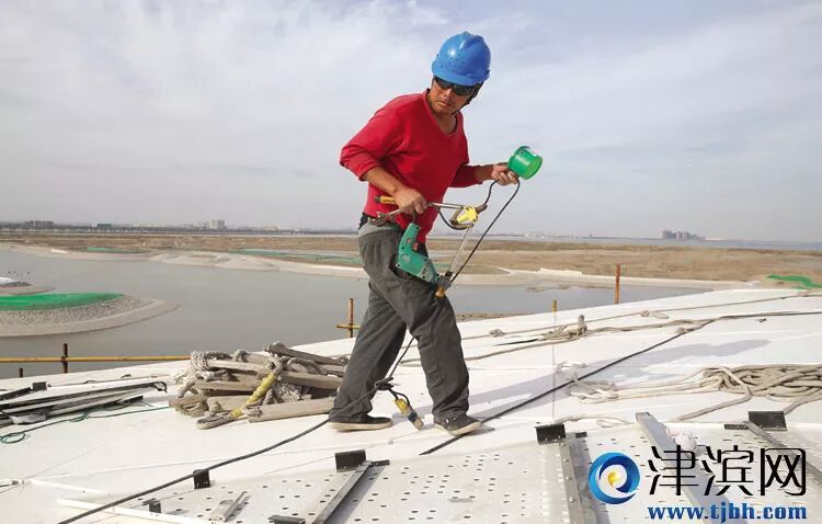“十一”国庆长假期间,在由中建八局承建的国家海洋博物馆施工现场看到,300多名工人坚守施工一线。在30多米高的屋顶,几位工人正在安装穿孔铝板,目前,穿孔铝板铺设已经完成90%。(贾磊摄影报道)