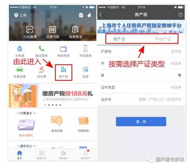 本次官方还在微信服务号上开通了“付费通账单查缴”(微信号ezhangdan)缴纳房产税。在微信号中选择公众号菜单“查缴账单--房产税”,输入输入房地产权证号或不动产权证号,即可进行查缴。