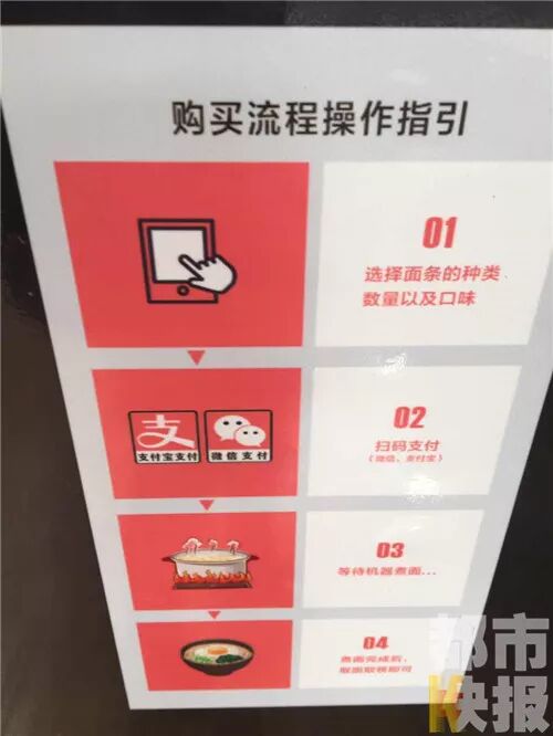 原来每台煮面机上都写有详细的操作流程,根据机器提示按下购买键就可以选择面条的种类、数量和口味,有微辣、中辣、麻辣等口味供消费者选择,选择完毕后用支付宝或者微信进行扫码付款。
