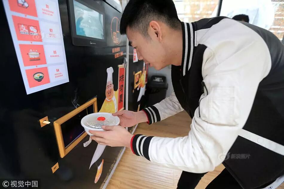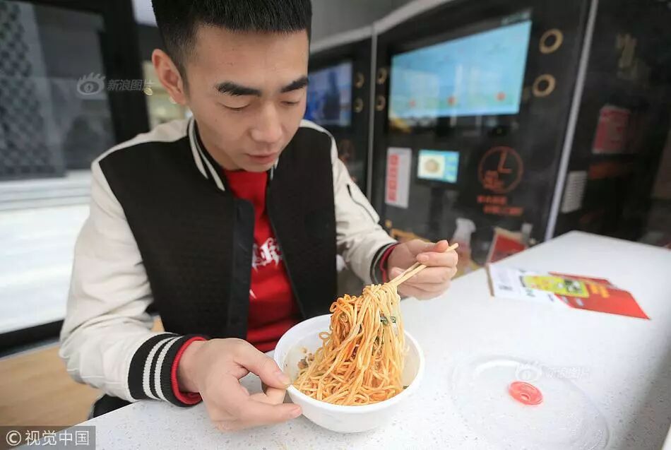研发人员说,他们把面条提前在工厂里加工到九成熟,然后和新鲜蔬菜一起运来,添加在机器里冷藏,顾客根据需要点单,机器就可以自动加热做面条。