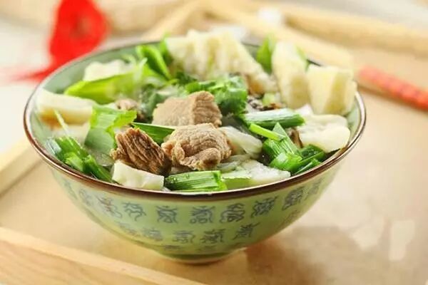 水盆羊肉以羊腩肉为主要食材,辅以姜丝、葱、香菜、粉丝,加入调料炒香后加入水焖煮,就着月牙烧饼同吃,肉烂汤清,肥而不腻。