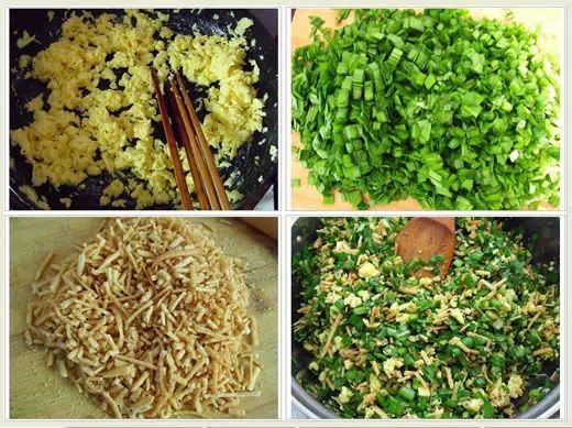 1、鸡蛋炒散,韭菜切碎,馓子用擀杖碾碎;