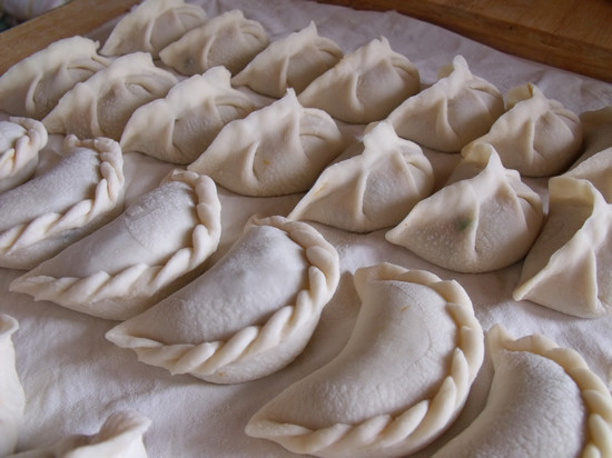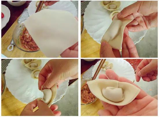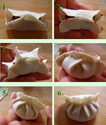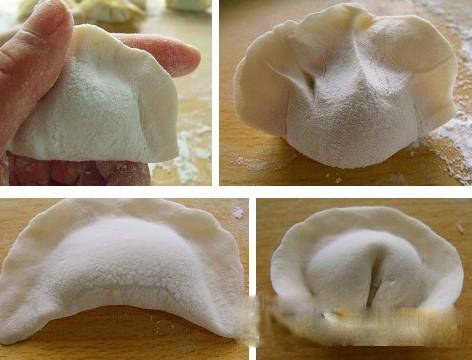 2、拿的姿势,肉馅不分往外,传统的就直接扭上就可以,但是元宝状的,要从上往下扭;