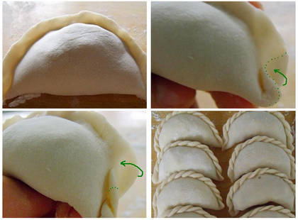 1、圆皮放上馅,对折,中间捏上,图一中黑色的线捏上;