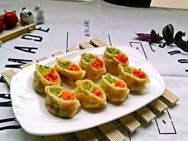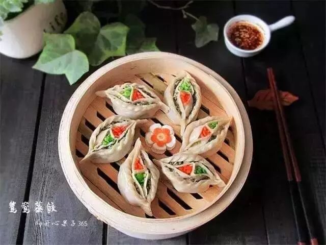 03鸳 鸯 蒸 饺包 法 图 解不同色彩的食材点缀上锅蒸后美美哒,食欲满满▽04青 菜 蒸 饺馅料做法:青菜用开水烫一下,和香菇、木耳、笋一起斩碎,挤干水分,加盐、鸡精、糖和麻油调好口味。包 法 图 解01