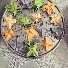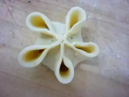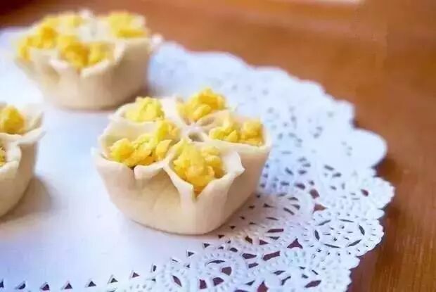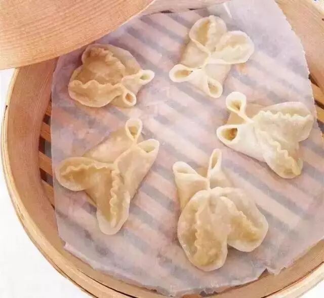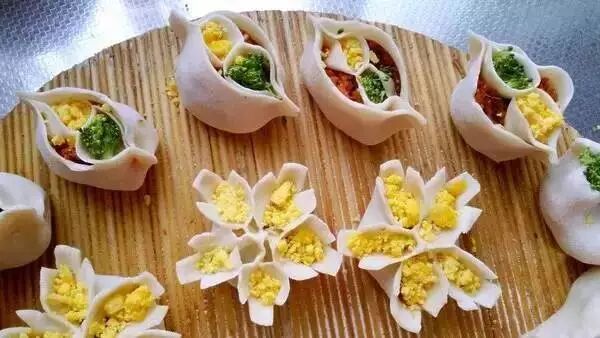 03鸳 鸯 蒸 饺包 法 图 解不同色彩的食材点缀上锅蒸后美美哒,食欲满满▽04青 菜 蒸 饺馅料做法:青菜用开水烫一下,和香菇、木耳、笋一起斩碎,挤干水分,加盐、鸡精、糖和麻油调好口味。包 法 图 解01把面团搓条,下剂子擀皮,包入馅心把圆皮均分5点,粘在一起形成5条边,把口捏紧