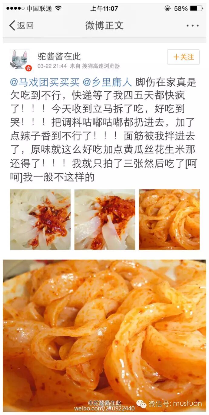 再就是,店主说“面皮酸味问题:面皮是纯小麦发酵的,所以亲们收到面皮打开后会闻到一点面酸味,是面皮发酵所产生的那种酸味,也正是面皮独有的那种味道,就如同刚出锅的馒头一样的味道,请大家放心食用,这是正常的。”这个确实是这样的!我吃到生命中第一份擀面皮的时候也觉得怪怪的啊!但是后面吃了好几十包都是一样的!这玩意就这样!拌进去调料就吃不出来了!就可以无视了!小伙伴们别担心!(家里有包饺子、蒸馒头、包包子的小伙伴应该是知道的,面团发酵的时候都会有酸味,正常的!)