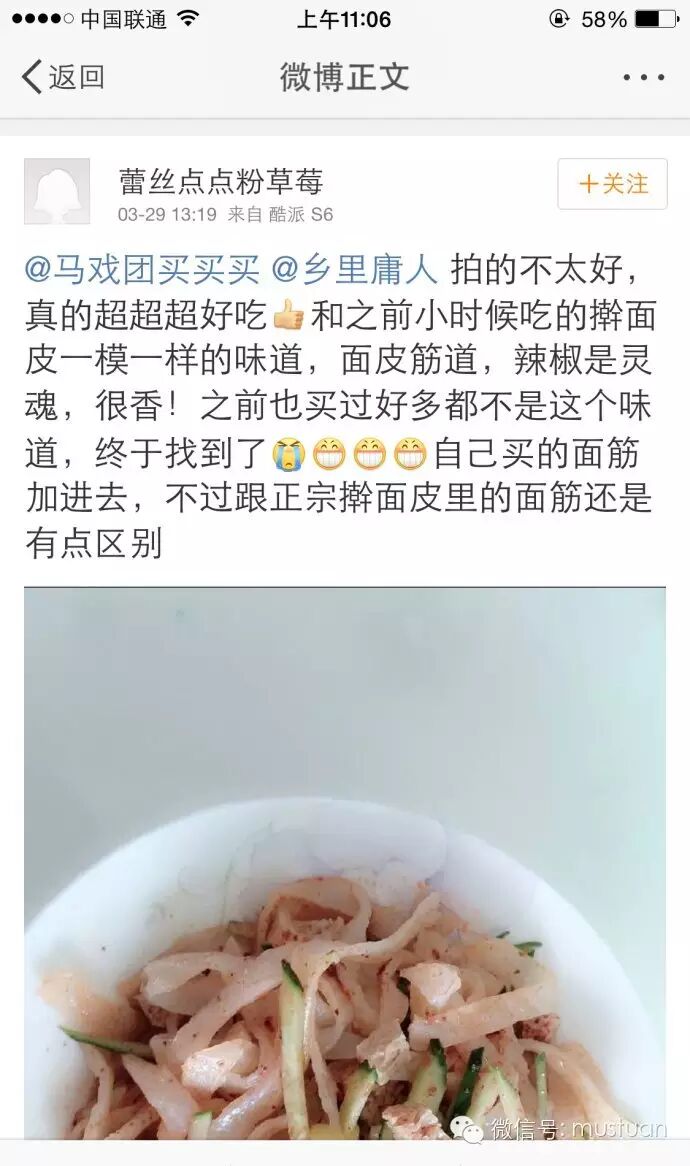 上面是我的实拍!棒棒的!第一张图是面皮+辣子+盐醋包,拌在一起,最基本的啦!第二张图是我在第一张图的基础上加了臊子肉,但是我有点加多了……虽然吃着真的超级过瘾,满口是肉,太香了好不好,但是加多了,也是很心疼滴!每次适当地加点肉,可以吃好多次哟!像我这样太贪心加太多肉,很快就会吃没了哟!有条件的家里切点黄瓜丝,放点细豆芽,切点香肠拌进去,会更好吃的!不过我家确实没有这些材料,我直接吃最基本的,也很好吃!