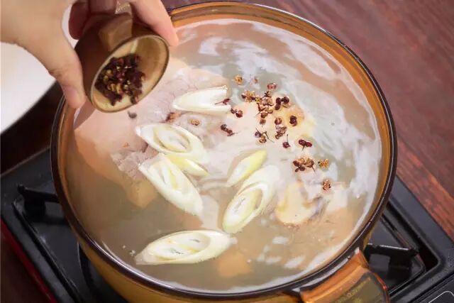 锅内放花椒、料酒、姜片、葱段,将猪肉煮熟后捞出冷却后切片备用。