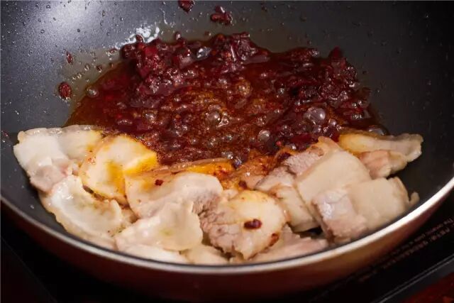 锅内热少许油,下肉片爆炒,把肉片推至一边,放红油豆瓣和酱香豆瓣各一勺,炒出红油后将肉片一起翻炒。