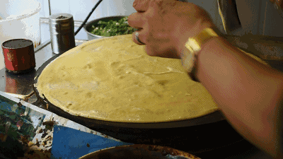 天津的煎饼,在用料和制作手法上都颇为考究。它不像山东煎饼那般香脆,却有着独特绵密的舒适口感。历经时代的发展,天津的煎饼已经从最早的黄豆面糊,衍生出了黄豆、绿豆、黑豆、小米、紫米等多种谷物的口味。