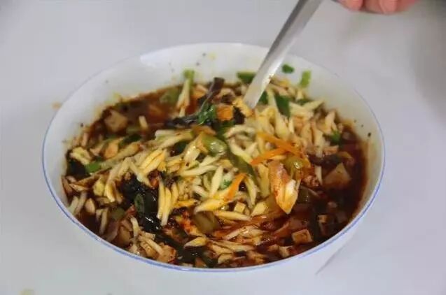 天水杂烩以夹板肉为主,配以响皮条、丸子,浇上鸡汤、撒上葱花、香菜、木耳等,盛入汤盆,量足汤多,荤素搭配,边喝边吃,不油不腻,味道鲜美。