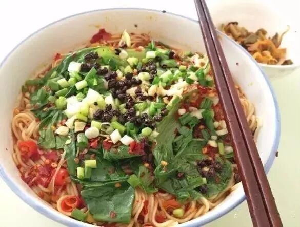 秦安辣子面又叫杠子面。用杠子压揉面团,小米面做成面波,擀成片,切成麦秆细的条,清水煮熟,柔软适度,不粘不糊,调上油泼辣子、醋、姜粉、芫荽等,别有风味。