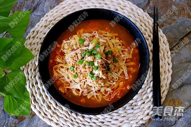1.千张切丝,金针菇切掉根部洗净,葱姜蒜切成片,小葱切碎,郫县豆瓣酱剁碎;烧开水,水开后放千张丝煮几分钟捞出备用