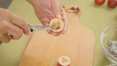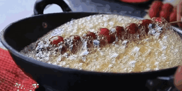 4. 包糖的动作要快,否则糖浆就会把水果烫熟。如果觉得糖浆黏度太大,导致水果表面糖浆太厚,可以把锅子再稍稍加热一下,恢复糖浆的流动性。