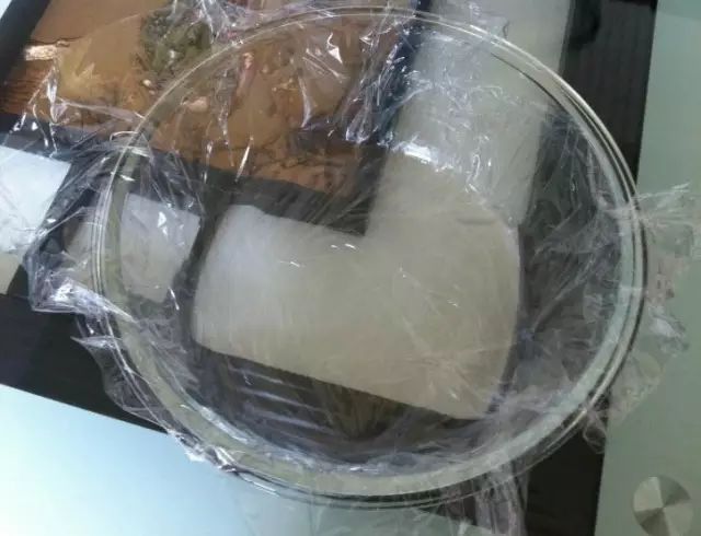8、容器内铺上保鲜膜,便于倒出不粘容器