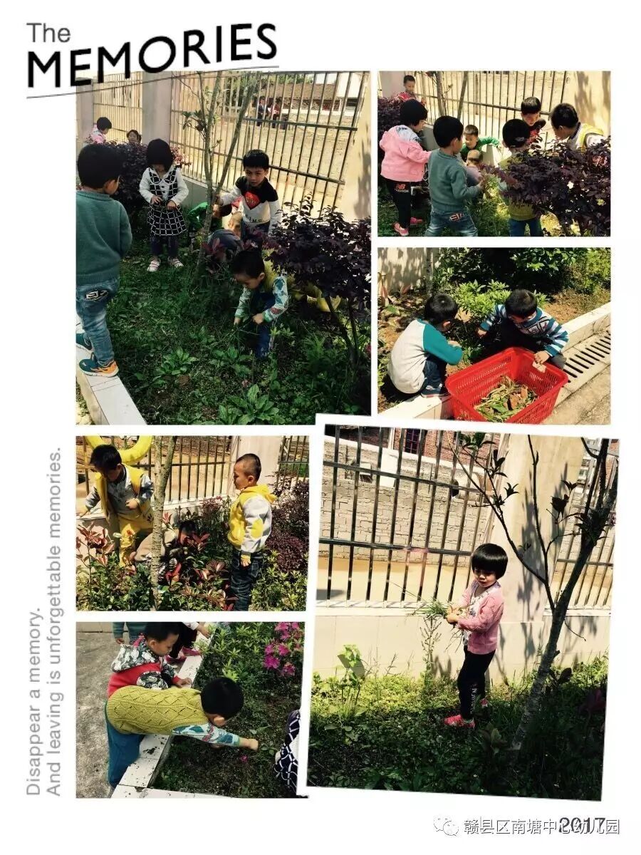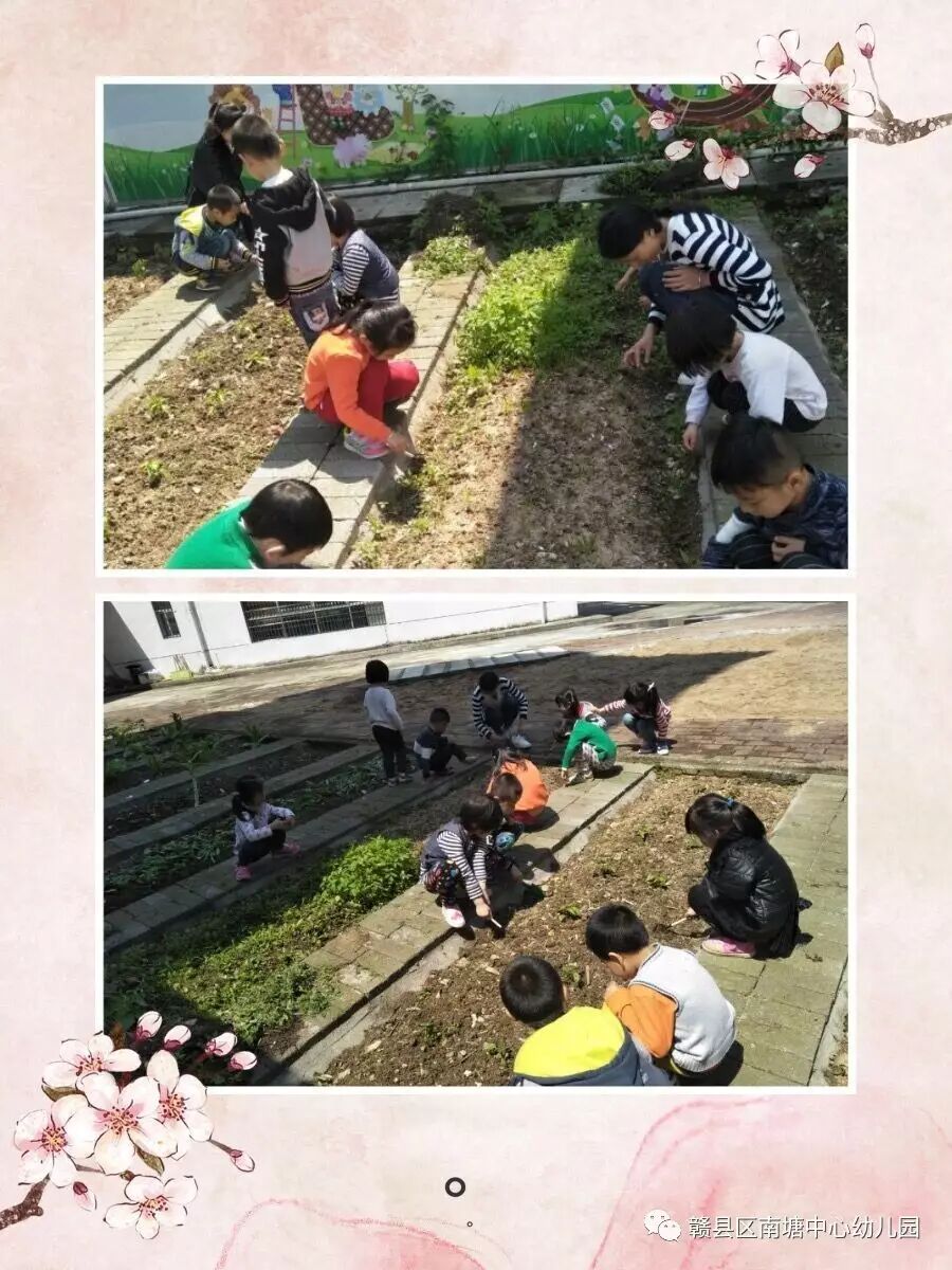中班老师组织幼儿到幼儿园内的花圃清理垃圾和石头