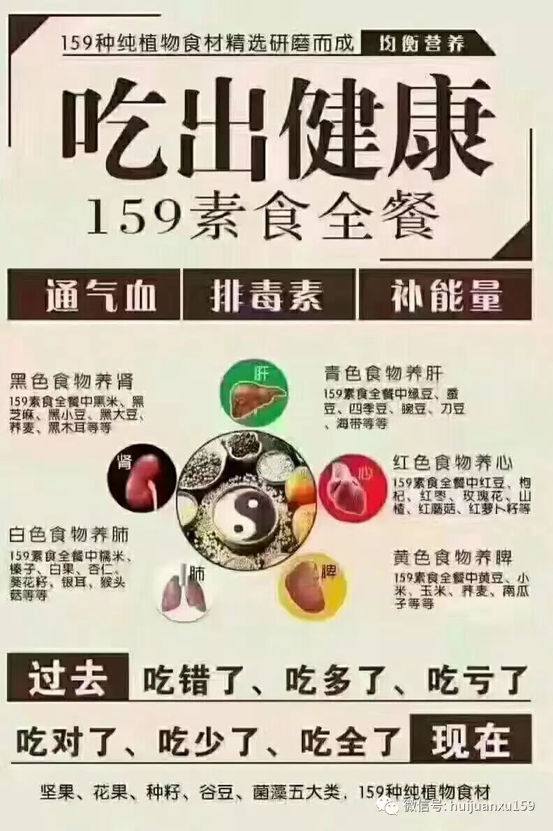 159素食全餐吸纳了古今中外的食疗养生理念,依据《黄帝内经》《易经》《本草纲目》等典籍,做到了食物搭配的五性五味相宜不忌,五色五行五方和谐配置,遵循”40种人体必需营养素、15种其它重要营养素”的国际营养学标准,而成功研发出的。