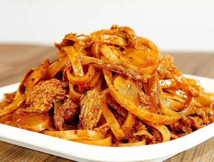 岐山面皮,原名“御京粉”,顾名思义,跟皇上有关系的。相传清朝康熙年间,岐山人王同江从北京皇宫带回故乡,传徒授艺而来。别名“酿皮”、“麦面皮”等。如今在陕西一带民间百姓生活中,以岐山擀面皮为最正宗的擀面皮。