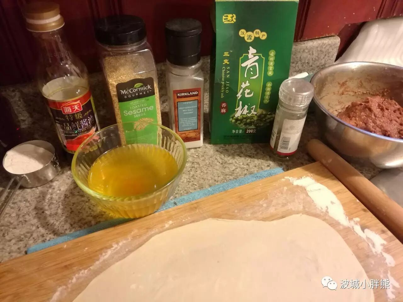 这图里有两样东西不太好搞,一是那碗黄澄澄的东西,那是鸭油。whole foods有时候有鸭子卖,每次我炖酸菜鸭汤的时候都会用鸭子的大量脂肪榨些油攒起来做饼,极香。二是那个绿色包装的汉源特产青花椒,麻香味全靠它。毕竟中国是花椒的原产地,建议有心的朋友从淘宝下单,EMS邮寄过来。然后找个带旋转研磨瓶口的小瓶子装着,比如图中肉馅盆子旁边的小瓶。临用的时候现磨花椒粉,香的不要不要的。据小花鼠说super88有卖这个花椒的,不知道质量如何。鸭油不好搞,我们也可以考虑用黄油替代一下。当然,如果你既没有鸭油也没有花椒,那就去chinatown买一瓶藤椒油吧,飞泉牌的不错。其他需要的东西就是芝麻和盐了,哪都能买得到,不多说了。