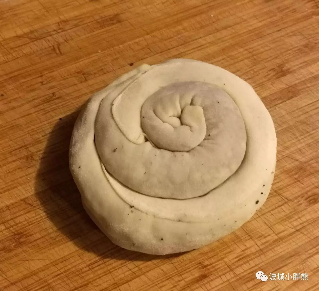 卷成蚊香状,恩,然后用手掌稍微压扁一点