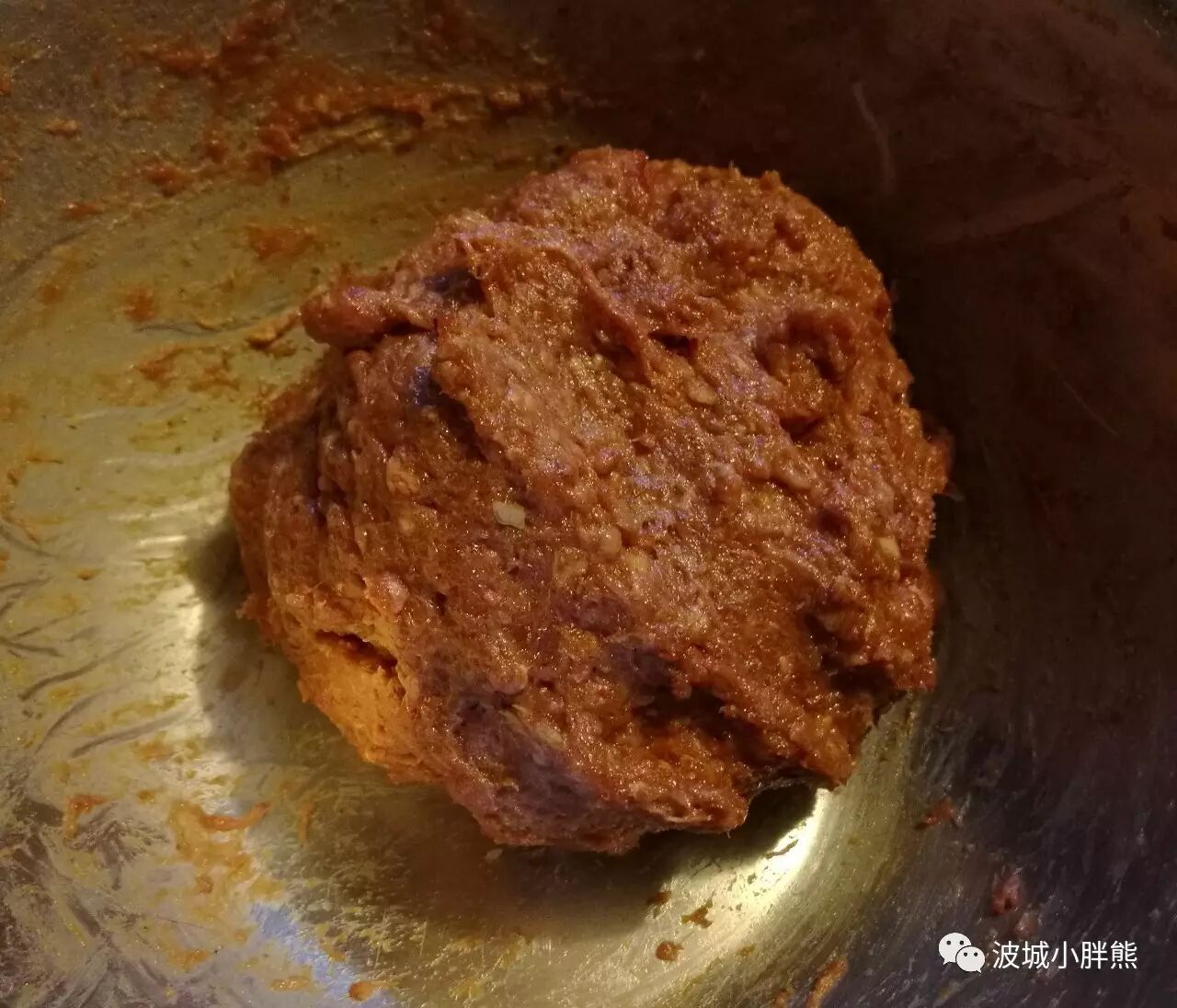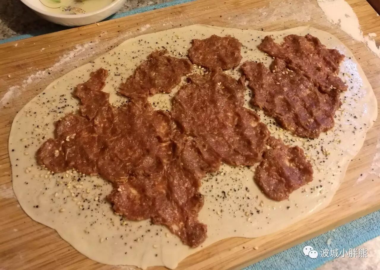 在醒面的时间里,我们来准备牛肉馅吧。牛肉馅我一贯的选用80%-85%瘦肉的那种,对于两人的饭量,1/2 lb都用不了,不过我建议还是调1/2 lb的肉馅,多余的可以弄个丸子汤,你想,吃着酥酥的肉饼,再喝口丸子汤,生活多美好。肉馅先裹在kitchen towel里用手挤压挤压,能挤出一些血水,手动去腥,恩。然后嘛,把刚才的花椒水倒进去。之后我们用蜂蜜,香料,和酱油再稍微做一下调味。蜂蜜不多解释了,在肉馅上淋一层就好,香料和酱油我推荐下面这张图里的: