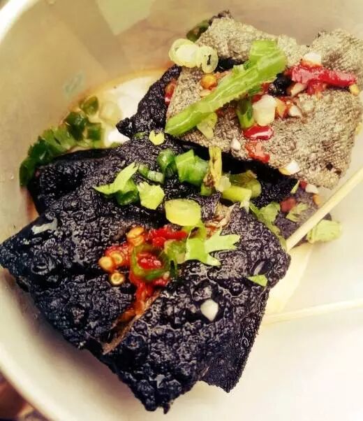 一块块黑色的小豆腐味道一点都不臭,吃起来香脆可口,足足的汤汁包在里面,辣椒的量也是刚刚好,吃臭豆腐也是有技巧的:先在上面戳几个小洞,把酱和汁倒进去再吃,一口烫烫的臭豆腐吃下去,有一种酣畅淋漓的快感!