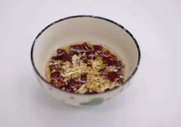 将这油和里面的花椒、蒜末、辣椒段舀一勺出来倒入另一碗里,加入四勺生抽、三勺凉开水、半勺香醋,调成调料汁儿。因为觉得油有点多,所以我只用了一部分,剩下的作为别的拌菜用吧。