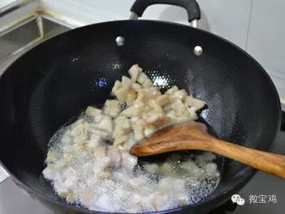 3、热锅凉油,大概就是一斤肉一两油的比例,倒入肥肉煸炒。
