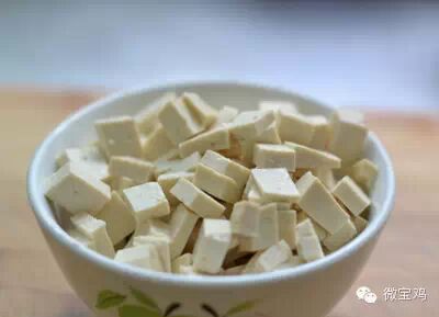 21、豆腐切丁(用炸过的豆腐比较好,炒的时候不会粘锅)。