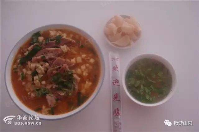 山阳羊肉泡是山阳县的特色小吃。山阳羊肉泡在煮馍过程中加入了羊油熬成的辣油,辣味与羊肉的鲜香浑然天成,形成了浓郁的百分百山阳味道。