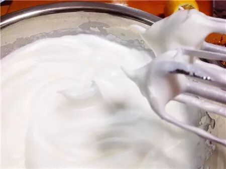 4、在蛋白里加入几滴柠檬汁用电动打蛋器打均匀,然后加入盐至鱼眼泡状态,再分三次加入糖,打至蛋白浓稠,表面出现明显纹路,非常细腻的干性发泡状态