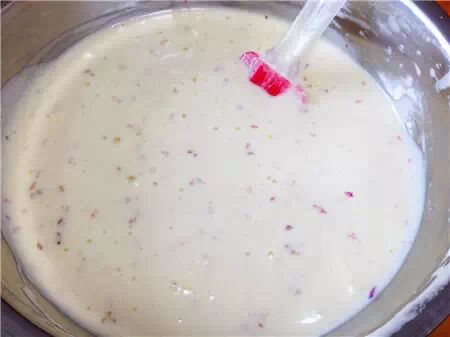 7、将拌好的蛋黄糊以一定的高度倒回蛋白中,再次以J字型手法,用刮刀翻拌,切拌均匀