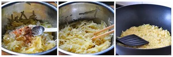 6、热锅入凉油,下入土豆丝,并摊平,保持中火煎制;