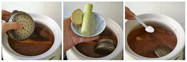 5、锅中下入肉,老卤汤,生抽老抽开水烧开