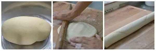 9、取一份面团擀成长条状,中间用擀面杖压出一条状印痕