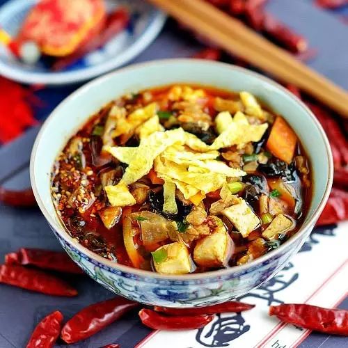 26、浇上呛好的臊子汤,最后撒上蛋皮和韭菜(蒜苗最佳,夏天没蒜苗啊)少许即可