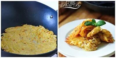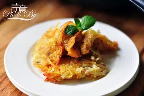 7、一面煎至焦黄后,来一个“大颠勺”,给土豆饼翻身;不会颠勺,就用锅铲;待令一面也煎至焦黄后,出锅即可