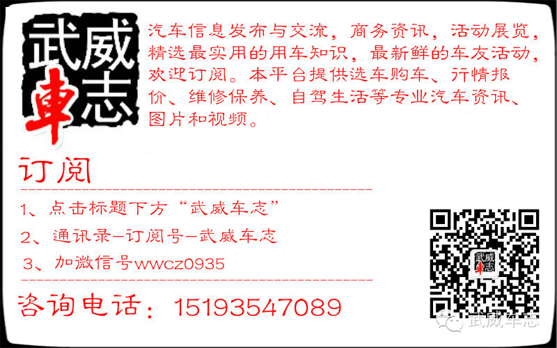 关注武威车志微信公众号:wwcz0935 这里会给您最新最全的汽车资讯,给你看更多精彩实用内容!如有关于汽车的任何疑问,我们会即时为车主答疑解惑!