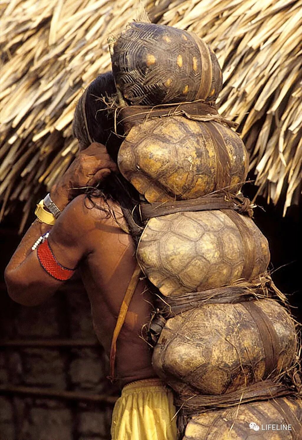 ▲当地人抓到龟后就这样绑在树上,图为黄腿陆龟
