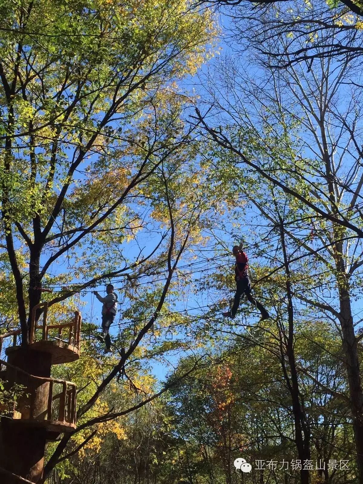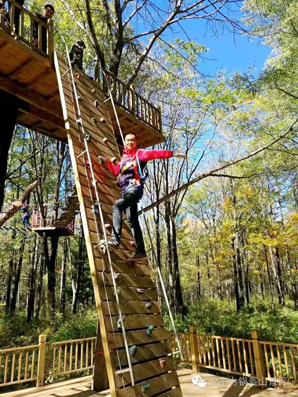 我们工作人员系好安全绳穿梭在森林探险游乐项目中,体验着惊险刺激的感觉。