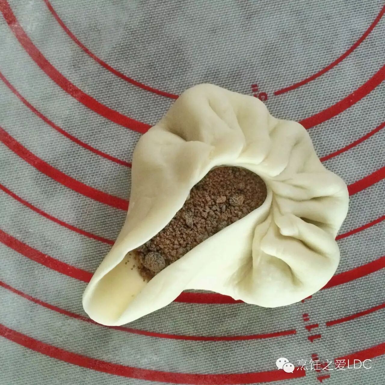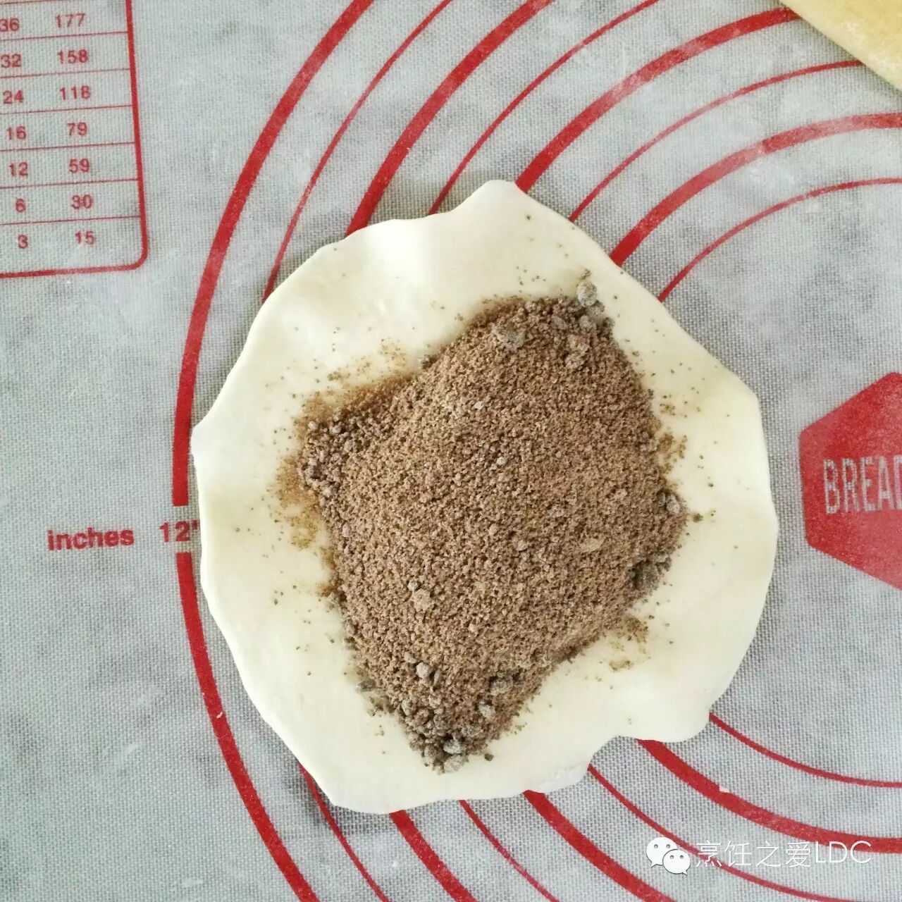 3.醒发好的面团取出来揉几下,取每个面团大约40克,搓圆按扁,擀成中间厚周围薄的面皮,放入15~20克的红糖馅