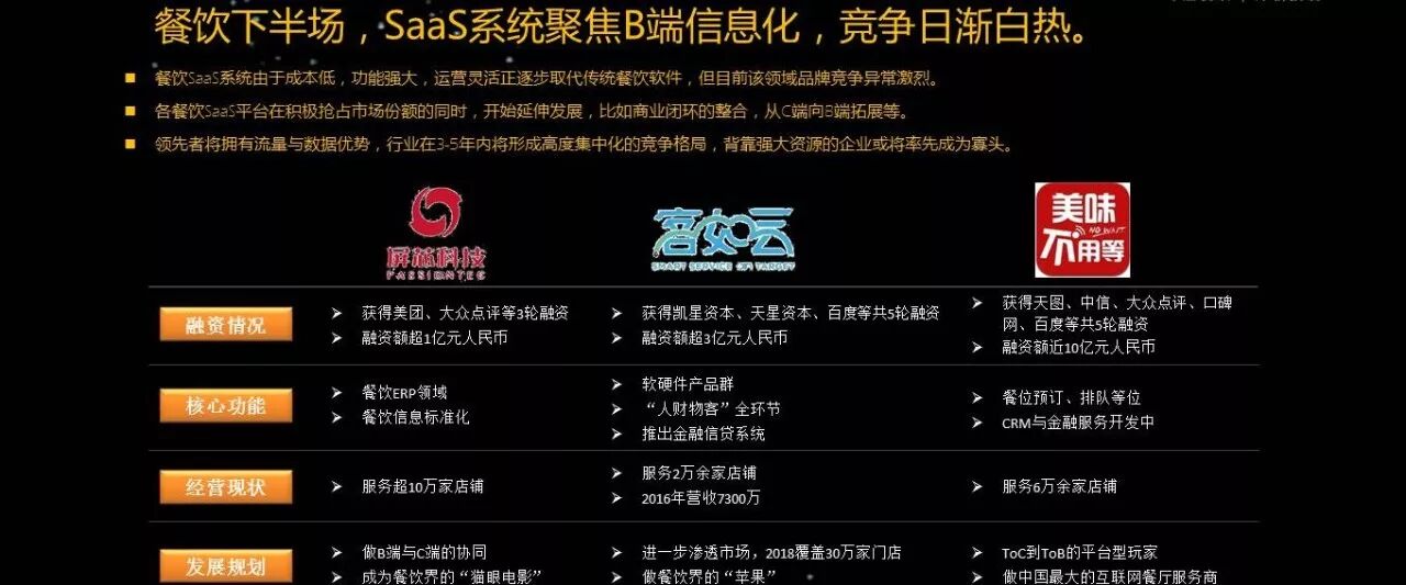 在餐饮的下半场当中,SaaS系统获得的融资也是最多的,获得的融资项目数特别多。统计了一下,总共接近20家餐饮的SaaS系统获得了投资。
