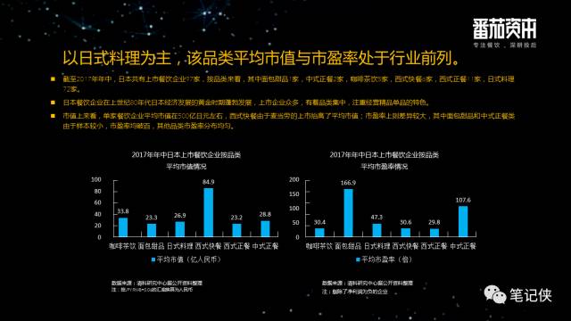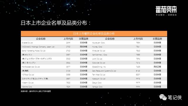 我到日本尽调一个项目时,日本当时92家上市企业,短短半年时间之后,今年97家上市餐饮企业。截止到2017年中,按品类划分,面包甜品2家,西式快餐6家,西式正餐11家,日料72家。